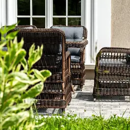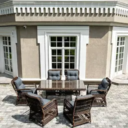 Вся мебель изготовлена из алюминия, вручную оплетенного круглым искусственным ротангом натурального соломенного оттенка. Столешница укомплектована ударопрочным стеклом, толщиной 5 мм.
