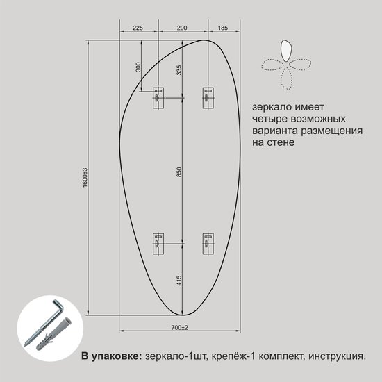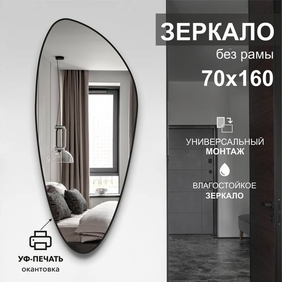 ✅Ключевые характеристикиЗеркало нестандартной формы размером 1600 на 700 мм выполнено из качественного зеркального стекла с металлической рамой. Вес изделия составляет 1.1375 кг; что облегчает монтаж и транспортировку. Гарантийный срок эксплуатации составляет 24 месяца; а общий срок службы - 5 лет.✅Преимущества и отличияОсобенностью модели является шлифованная кромка; которая придаёт изделию аккуратный и современный вид; а также УФ-печать чёрного цвета; обеспечивающая стильный дизайн и долговечность покрытия. Зеркало предназначено для подвесного монтажа; что позволяет удобно разместить его в любом интерьере.✅ПрактичностьОтсутствие подсветки делает изделие универсальным и простым в использовании; а металлический каркас гарантирует надёжность и устойчивость к деформациям. Благодаря нестандартной форме зеркало станет акцентом в помещении; при этом легко впишется в различные стили оформления.✅УникальностьМодель выделяется сочетанием качественного зеркального материала с металлической рамой и оригинальной формой; дополненной УФ-печатью. Это придаёт изделию современный и эксклюзивный вид; который подчеркнёт индивидуальность интерьера и создаст атмосферу уюта.✅Ключевые характеристикиЗеркало нестандартной формы размером 1600 на 700 мм выполнено из качественного зеркального стекла с металлической рамой. Вес изделия составляет 1.1375 кг; что облегчает монтаж и транспортировку. Гарантийный срок эксплуатации составляет 24 месяца; а общий срок службы - 5 лет.✅Преимущества и отличияОсобенностью модели является шлифованная кромка; которая придаёт изделию аккуратный и современный вид; а также УФ-печать чёрного цвета; обеспечивающая стильный дизайн и долговечность покрытия. Зеркало предназначено для подвесного монтажа; что позволяет удобно разместить его в любом интерьере.✅ПрактичностьОтсутствие подсветки делает изделие универсальным и простым в использовании; а металлический каркас гарантирует надёжность и устойчивость к деформациям. Благодаря нестандартной форме зеркало станет акцентом в помещении; при этом легко впишется в различные стили оформления.✅УникальностьМодель выделяется сочетанием качественного зеркального материала с металлической рамой и оригинальной формой; дополненной УФ-печатью. Это придаёт изделию современный и эксклюзивный вид; который подчеркнёт индивидуальность интерьера и создаст атмосферу уюта.