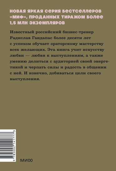 - ✅ Радислав Гандапас, известный российский бизнес-тренер, более десяти лет обучает ораторскому мастерству. В этой книге вы найдете ценные советы и техники, которые помогут вам полюбить выступления и научиться эффективно взаимодействовать с аудиторией.✅ Искусство ораторского мастерства — это не только умение говорить, но и способность передавать свою энергию слушателям. Книга предлагает практические рекомендации, которые помогут вам раскрыть свой потенциал и научиться получать удовольствие от общения с людьми.✅ Вы научитесь не только привлекать внимание аудитории, но и добиваться поставленных целей во время выступлений. Эта книга станет вашим надежным помощником на пути к мастерству публичных выступлений и уверенности в себе. ⚠️ Не упустите возможность изменить свое отношение к ораторскому искусству и стать настоящим мастером общения! ✅ Радислав Гандапас, известный российский бизнес-тренер, более десяти лет обучает ораторскому мастерству. В этой книге вы найдете ценные советы и техники, которые помогут вам полюбить выступления и научиться эффективно взаимодействовать с аудиторией.✅ Искусство ораторского мастерства — это не только умение говорить, но и способность передавать свою энергию слушателям. Книга предлагает практические рекомендации, которые помогут вам раскрыть свой потенциал и научиться получать удовольствие от общения с людьми.✅ Вы научитесь не только привлекать внимание аудитории, но и добиваться поставленных целей во время выступлений. Эта книга станет вашим надежным помощником на пути к мастерству публичных выступлений и уверенности в себе. ⚠️ Не упустите возможность изменить свое отношение к ораторскому искусству и стать настоящим мастером общения!