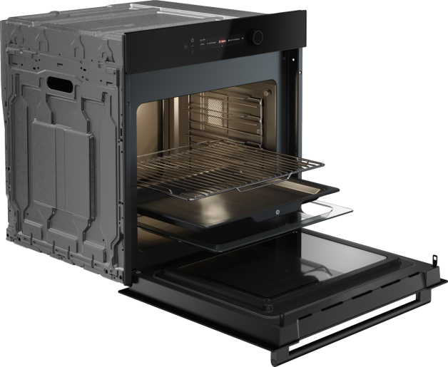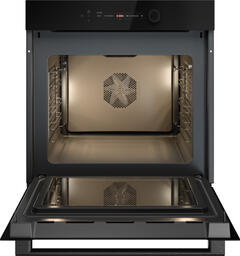Особенности дизайна и внешней панели управления — также важный пункт при выборе духовки на кухню. В данной модели нужно обратить внимание на цвет — черное стекло, охлаждение двери, чтобы поверхность и мебель вокруг не нагревались.