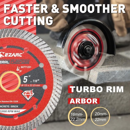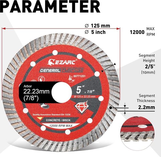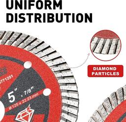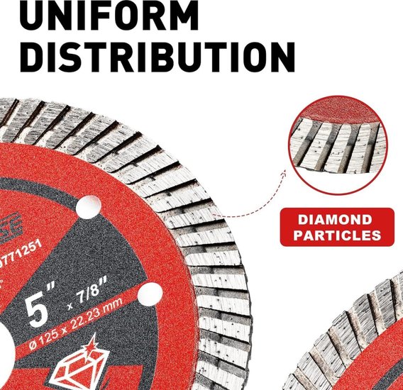 ✅Алмазный турбо диск диаметром 5 дюймов предназначен для быстрой и эффективной резки различных каменных материалов; включая фарфор; гранит; мрамор; кирпич и бетон. Он подходит как для профессионального использования; так и для домашних мастеров. ✅Особенностью диска являются турбо сегменты; которые обеспечивают плавный и чистый срез; а также способствуют эффективному охлаждению; что предотвращает перегрев и увеличивает срок службы инструмента. ✅Диск изготовлен с использованием алмазного зерна премиум-класса с твердостью HRC90+; что гарантирует долговечность и высокую производительность даже при интенсивной работе. ✅Конструкция из высокопрочной легированной стали и алмазной матрицы обеспечивает безопасную резку без искр и следов прижигания; а универсальность позволяет использовать диск как для сухой; так и для мокрой резки.✅Алмазный турбо диск диаметром 5 дюймов предназначен для быстрой и эффективной резки различных каменных материалов; включая фарфор; гранит; мрамор; кирпич и бетон. Он подходит как для профессионального использования; так и для домашних мастеров. ✅Особенностью диска являются турбо сегменты; которые обеспечивают плавный и чистый срез; а также способствуют эффективному охлаждению; что предотвращает перегрев и увеличивает срок службы инструмента. ✅Диск изготовлен с использованием алмазного зерна премиум-класса с твердостью HRC90+; что гарантирует долговечность и высокую производительность даже при интенсивной работе. ✅Конструкция из высокопрочной легированной стали и алмазной матрицы обеспечивает безопасную резку без искр и следов прижигания; а универсальность позволяет использовать диск как для сухой; так и для мокрой резки.