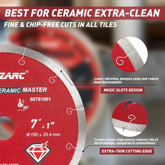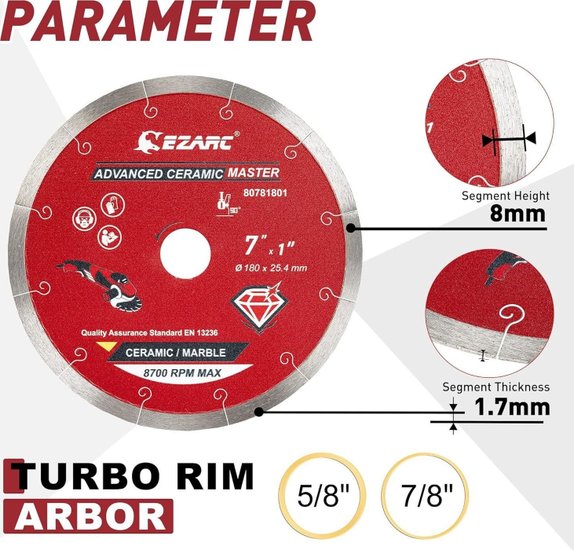 ✅Усовершенствованный керамический алмазный диск предназначен для сверхчистой и точной резки мрамора; кирпича; керамики и плитки. Он обеспечивает долговечность и высокую производительность благодаря матрице из легированной стали с равномерным распределением алмазов.✅Технология Music-Slot снижает вибрацию и шум во время работы; что позволяет выполнять более плавные и аккуратные резы; минимизируя риск сколов и повреждений; особенно при работе с деликатными материалами.✅Диск диаметром 7 дюймов подходит для большинства плиткорезов и угловых шлифовальных машин с посадочным диаметром 25,4-20-16 мм. Высота сегмента составляет 8 мм; а толщина сегмента 1,7 мм; что гарантирует длительный срок службы даже при интенсивном использовании.✅Изготовлен из высокопрочной легированной стали и алмазной матрицы премиум-класса; диск универсален для сухой и мокрой резки; обеспечивая резку без искр и следов прижигания. Идеален как для профессиональных укладчиков плитки; так и для домашних мастеров.✅Усовершенствованный керамический алмазный диск предназначен для сверхчистой и точной резки мрамора; кирпича; керамики и плитки. Он обеспечивает долговечность и высокую производительность благодаря матрице из легированной стали с равномерным распределением алмазов.✅Технология Music-Slot снижает вибрацию и шум во время работы; что позволяет выполнять более плавные и аккуратные резы; минимизируя риск сколов и повреждений; особенно при работе с деликатными материалами.✅Диск диаметром 7 дюймов подходит для большинства плиткорезов и угловых шлифовальных машин с посадочным диаметром 25,4-20-16 мм. Высота сегмента составляет 8 мм; а толщина сегмента 1,7 мм; что гарантирует длительный срок службы даже при интенсивном использовании.✅Изготовлен из высокопрочной легированной стали и алмазной матрицы премиум-класса; диск универсален для сухой и мокрой резки; обеспечивая резку без искр и следов прижигания. Идеален как для профессиональных укладчиков плитки; так и для домашних мастеров.