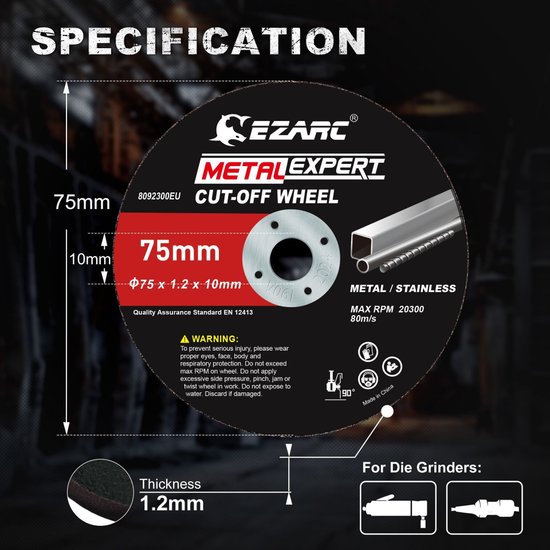 ✅Отрезной диск по металлу и нержавеющей стали EZARC изготовлен из белого корунда с иридиевым покрытием; что обеспечивает в 2 раза больший срок службы по сравнению с обычными дисками. Благодаря специальной технологии производства из абразива на основе оксида алюминия; диск обладает высокой прочностью; остротой и долговечностью.✅Диски предназначены для универсального применения и подходят для сверхбыстрой и чистой резки углеродистой стали; нержавеющей стали; железа; меди и других черных металлов. Их тонкая конструкция толщиной 1/16 дюйма обеспечивает точный рез с минимальным количеством заусенцев и отходов.✅Отрезные круги совместимы с большинством 3-дюймовых угловых шлифовальных машин и имеют посадочное отверстие 3/8 дюйма. Максимальная рабочая скорость дисков достигает 25000 об/мин; что гарантирует высокую производительность и безопасность при работе.✅Диски EZARC соответствуют международным стандартам безопасности EN 12413 и ASM07. Они созданы для выполнения сложных проектов по резке металла; сохраняют высокую скорость резки на протяжении всего срока службы и обеспечивают отличное соотношение цены и качества.✅Отрезной диск по металлу и нержавеющей стали EZARC изготовлен из белого корунда с иридиевым покрытием; что обеспечивает в 2 раза больший срок службы по сравнению с обычными дисками. Благодаря специальной технологии производства из абразива на основе оксида алюминия; диск обладает высокой прочностью; остротой и долговечностью.✅Диски предназначены для универсального применения и подходят для сверхбыстрой и чистой резки углеродистой стали; нержавеющей стали; железа; меди и других черных металлов. Их тонкая конструкция толщиной 1/16 дюйма обеспечивает точный рез с минимальным количеством заусенцев и отходов.✅Отрезные круги совместимы с большинством 3-дюймовых угловых шлифовальных машин и имеют посадочное отверстие 3/8 дюйма. Максимальная рабочая скорость дисков достигает 25000 об/мин; что гарантирует высокую производительность и безопасность при работе.✅Диски EZARC соответствуют международным стандартам безопасности EN 12413 и ASM07. Они созданы для выполнения сложных проектов по резке металла; сохраняют высокую скорость резки на протяжении всего срока службы и обеспечивают отличное соотношение цены и качества.