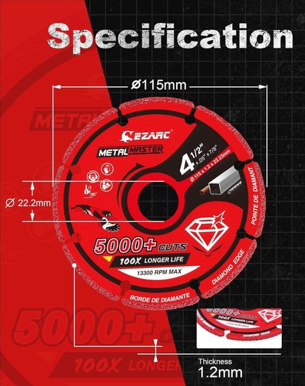 ✅Алмазный отрезной диск EZARC предназначен для резки различных металлов; включая арматуру; сталь; железо и нержавеющую сталь. Он отличается высокой прочностью и долговечностью; что позволяет выполнять тысячи резов без потери качества.✅Диск обеспечивает гладкие и точные разрезы; при этом износ происходит значительно медленнее по сравнению с обычными отрезными кругами на связке. Это делает его идеальным выбором для профессионалов и домашних мастеров; которым важна надежность и эффективность.✅Корпус диска выполнен из цельной стали; что снижает риск разрушения и повышает безопасность при работе. Алмазная режущая кромка не загрязняется и не изнашивается; что уменьшает количество пыли и поддерживает чистоту на рабочем месте.✅Диск обладает промышленным качеством; обеспечивая стабильность; точность и долговечность резки. Он сохраняет первоначальный диаметр на протяжении всего срока службы; что улучшает контроль и качество работы.✅Алмазный отрезной диск EZARC предназначен для резки различных металлов; включая арматуру; сталь; железо и нержавеющую сталь. Он отличается высокой прочностью и долговечностью; что позволяет выполнять тысячи резов без потери качества.✅Диск обеспечивает гладкие и точные разрезы; при этом износ происходит значительно медленнее по сравнению с обычными отрезными кругами на связке. Это делает его идеальным выбором для профессионалов и домашних мастеров; которым важна надежность и эффективность.✅Корпус диска выполнен из цельной стали; что снижает риск разрушения и повышает безопасность при работе. Алмазная режущая кромка не загрязняется и не изнашивается; что уменьшает количество пыли и поддерживает чистоту на рабочем месте.✅Диск обладает промышленным качеством; обеспечивая стабильность; точность и долговечность резки. Он сохраняет первоначальный диаметр на протяжении всего срока службы; что улучшает контроль и качество работы.