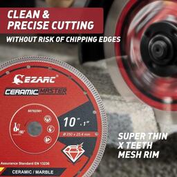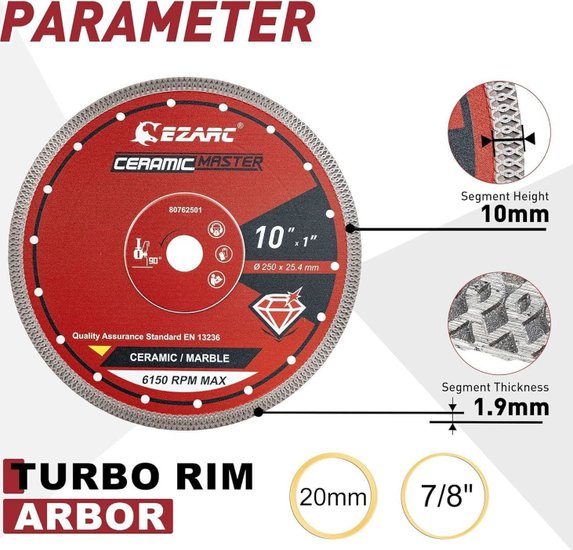 ✅Супертонкий алмазный диск диаметром 10 дюймов предназначен для резки плитки; мрамора и гранита; обеспечивая долговечность и высокую производительность. ✅Высококачественная матрица из легированной стали с равномерным распределением алмазов гарантирует длительный срок службы и эффективное удаление материала. Высота сегмента 10 мм позволяет работать с самыми твердыми материалами. ✅Диск с зубьями X turbo mesh обеспечивает чистые и гладкие резы; снижая сколы и боковое трение; что особенно важно при работе с мелкозернистым сланцем и мрамором. ✅Профессиональный дизайн с интегрированным фланцем и отверстиями для глушителя повышает стабильность; безопасность и снижает уровень шума; позволяя использовать диск как для сухой; так и для влажной резки.✅Супертонкий алмазный диск диаметром 10 дюймов предназначен для резки плитки; мрамора и гранита; обеспечивая долговечность и высокую производительность. ✅Высококачественная матрица из легированной стали с равномерным распределением алмазов гарантирует длительный срок службы и эффективное удаление материала. Высота сегмента 10 мм позволяет работать с самыми твердыми материалами. ✅Диск с зубьями X turbo mesh обеспечивает чистые и гладкие резы; снижая сколы и боковое трение; что особенно важно при работе с мелкозернистым сланцем и мрамором. ✅Профессиональный дизайн с интегрированным фланцем и отверстиями для глушителя повышает стабильность; безопасность и снижает уровень шума; позволяя использовать диск как для сухой; так и для влажной резки.