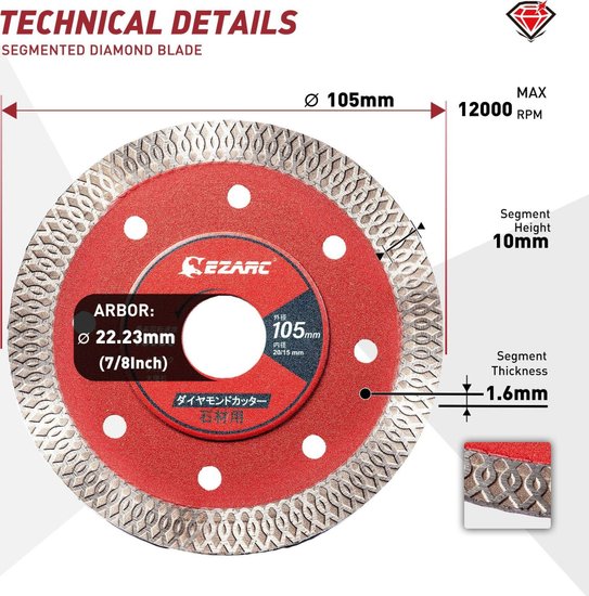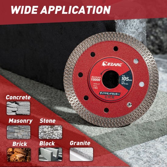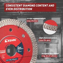 ✅Супертонкий алмазный диск предназначен для резки плитки; мрамора и гранита; обеспечивая долговечность и высокую производительность. Высококачественная матрица из легированной стали с равномерным распределением алмазов гарантирует длительный срок службы и эффективное удаление материала.✅Диски с зубьями X turbo mesh обеспечивают чистые и ровные разрезы; уменьшая сколы и боковое трение. Они подходят для работы с абразивными материалами; включая сверхтвердый мелкозернистый сланец и мрамор; сохраняя качество резки без повреждений краев.✅Диаметр диска составляет 5 дюймов (105 мм); посадочный диаметр 15/20 мм; толщина сегмента 1 мм; высота сегмента 10 мм. Максимальная скорость вращения достигает 12 000 об/мин. Диски совместимы с большинством плиткорезов и угловых шлифовальных машин.✅Профессиональный дизайн с интегрированным фланцем обеспечивает стабильность и безопасность резки; снижая вибрацию. Отверстия для глушителя уменьшают шум и предотвращают перегрев во время работы. Подходят для сухой и влажной резки различных материалов; включая фарфор; гранит; керамическую плитку; кирпич и цемент.✅Супертонкий алмазный диск предназначен для резки плитки; мрамора и гранита; обеспечивая долговечность и высокую производительность. Высококачественная матрица из легированной стали с равномерным распределением алмазов гарантирует длительный срок службы и эффективное удаление материала.✅Диски с зубьями X turbo mesh обеспечивают чистые и ровные разрезы; уменьшая сколы и боковое трение. Они подходят для работы с абразивными материалами; включая сверхтвердый мелкозернистый сланец и мрамор; сохраняя качество резки без повреждений краев.✅Диаметр диска составляет 5 дюймов (105 мм); посадочный диаметр 15/20 мм; толщина сегмента 1 мм; высота сегмента 10 мм. Максимальная скорость вращения достигает 12 000 об/мин. Диски совместимы с большинством плиткорезов и угловых шлифовальных машин.✅Профессиональный дизайн с интегрированным фланцем обеспечивает стабильность и безопасность резки; снижая вибрацию. Отверстия для глушителя уменьшают шум и предотвращают перегрев во время работы. Подходят для сухой и влажной резки различных материалов; включая фарфор; гранит; керамическую плитку; кирпич и цемент.