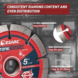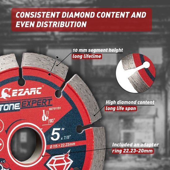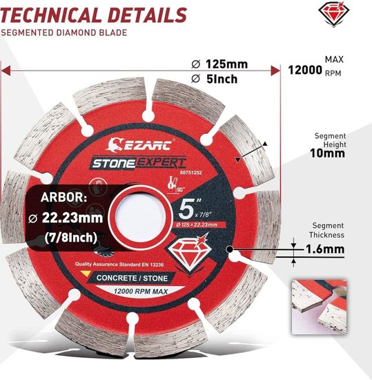 ✅Сегментированный алмазный диск диаметром 5 дюймов предназначен для резки бетона; кирпичной кладки; камня и блоков. Высокопроизводительная алмазная матрица с постоянным содержанием алмазов и равномерным распределением обеспечивает длительный срок службы и эффективное удаление материала.✅Диск оснащён сегментами высотой 10 мм; что гарантирует долговечность даже при работе с самыми твёрдыми материалами. Он подходит для большинства угловых шлифовальных машин с посадочным диаметром 7/8 дюйма и обеспечивает быструю и точную резку.✅Изготовлен из высокопрочной легированной стали и качественной алмазной матрицы; диск обеспечивает резку без искр и прижогов. Универсален для сухой и влажной резки; что расширяет возможности его применения.✅Идеален для профессионалов и любителей DIY; подходит для строителей; сантехников; укладчиков плитки и кровельщиков. В комплекте поставляется 2 диска красного цвета; каждый весом около 292 грамм.✅Сегментированный алмазный диск диаметром 5 дюймов предназначен для резки бетона; кирпичной кладки; камня и блоков. Высокопроизводительная алмазная матрица с постоянным содержанием алмазов и равномерным распределением обеспечивает длительный срок службы и эффективное удаление материала.✅Диск оснащён сегментами высотой 10 мм; что гарантирует долговечность даже при работе с самыми твёрдыми материалами. Он подходит для большинства угловых шлифовальных машин с посадочным диаметром 7/8 дюйма и обеспечивает быструю и точную резку.✅Изготовлен из высокопрочной легированной стали и качественной алмазной матрицы; диск обеспечивает резку без искр и прижогов. Универсален для сухой и влажной резки; что расширяет возможности его применения.✅Идеален для профессионалов и любителей DIY; подходит для строителей; сантехников; укладчиков плитки и кровельщиков. В комплекте поставляется 2 диска красного цвета; каждый весом около 292 грамм.
