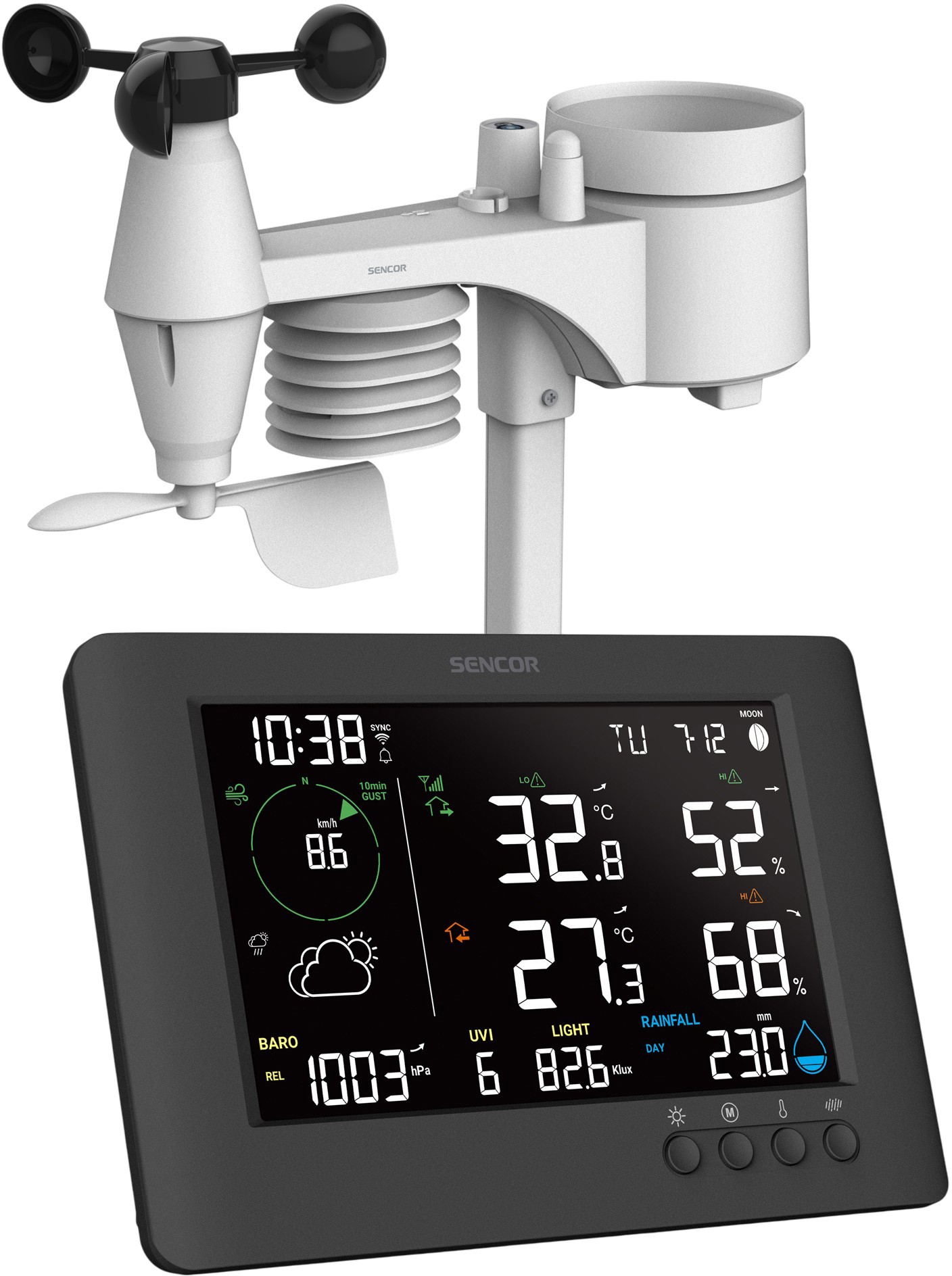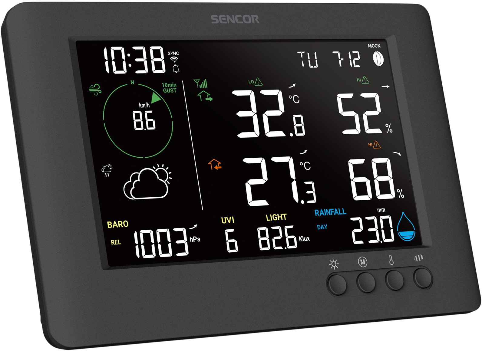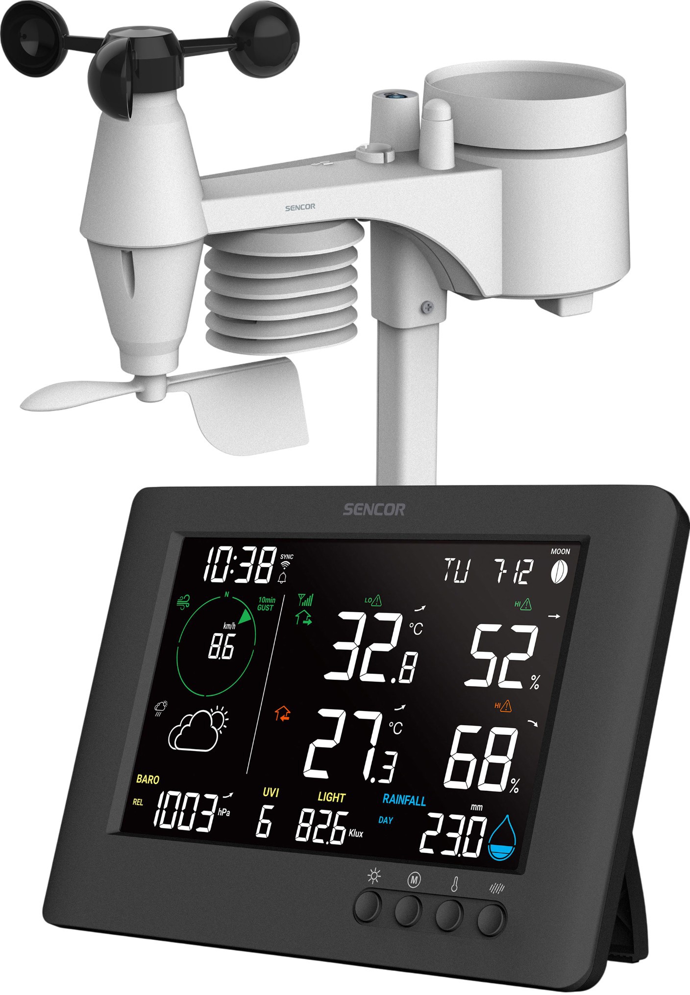 • Измерения прогноз погодывнутренняя температуравнешняя температуравнутренняя влажностьвнешняя влажностьатмосферное давлениескорость и направление ветрауровень осадковУФ излучение