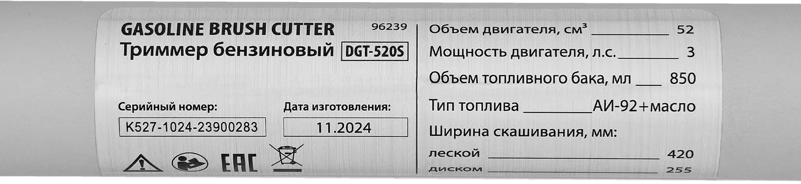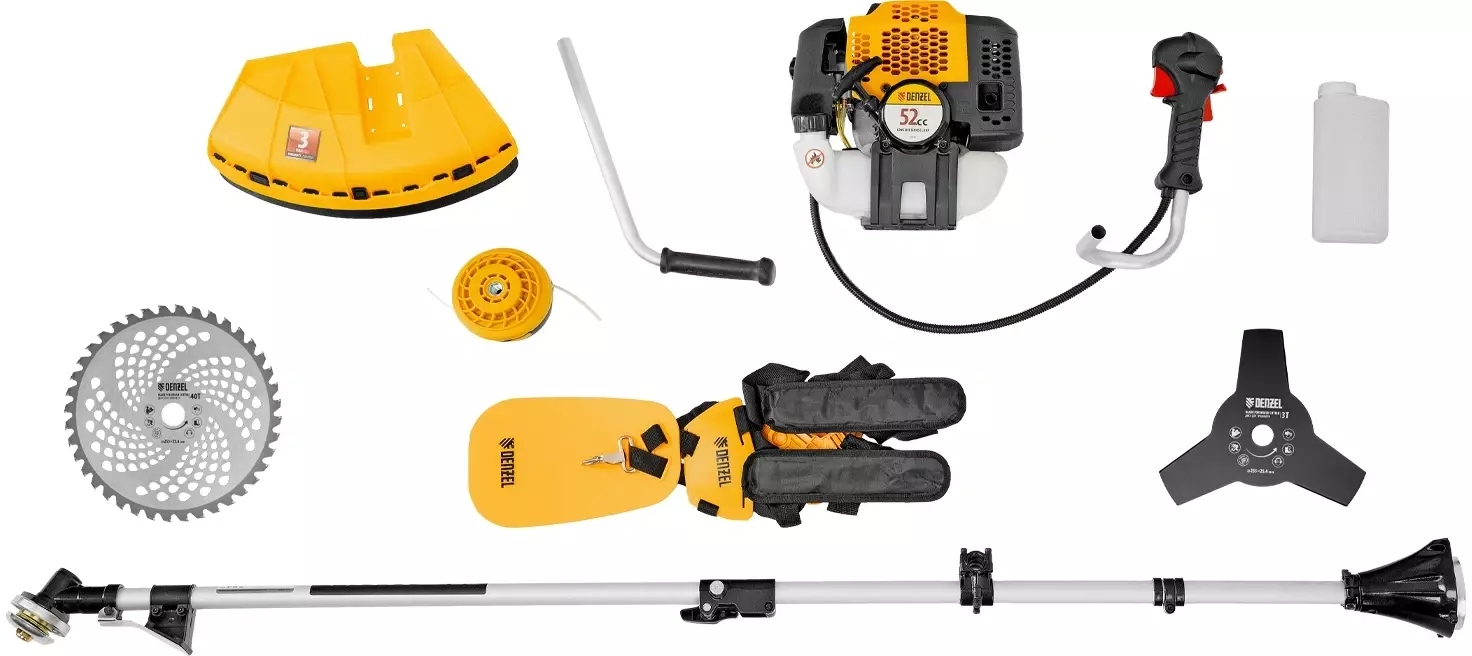 Комплект поставкиТриммер бензиновый, катушка, нож трехлопастной 3Т, пильный диск 40Т, двухплечевая подвесная система с защитой бедра, дозатор для приготовления смеси, набор крепежа, набор инструментов, руководство по эксплуатации с гарантийным талоном.