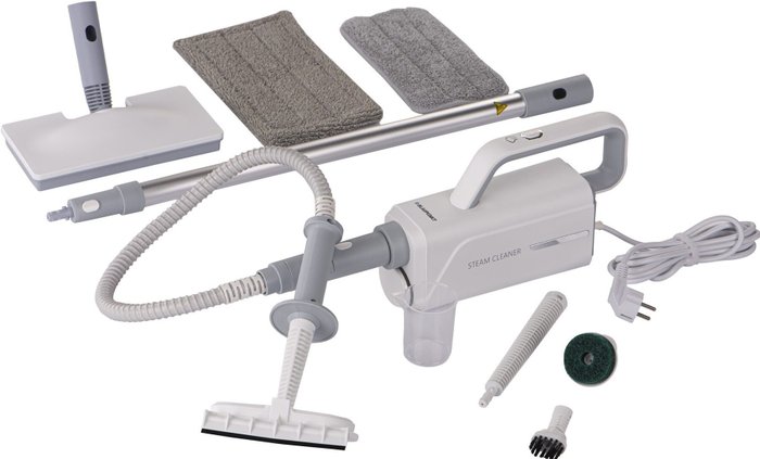 Комплектациянапольная насадка, две моп-тряпки, удлинительная трубка, удлинительный шланг, насадка с нейлоновой щеткой, насадка с падом, длинная щелевая насадка, насадка для окон с коллектором, насадка для глажки, мерный стакан