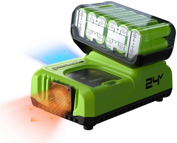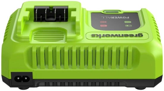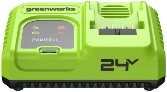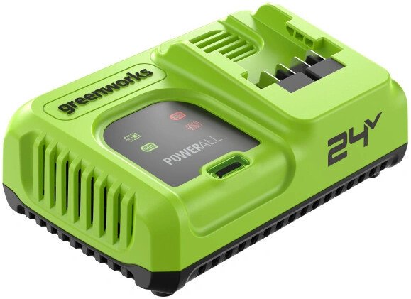 Ультрабыстрое зарядное устройство Greenworks 24В G24C8 8А (Арт.2958707) — современное зарядное устройство для ультрабыстрой и безопасной зарядки всех аккумуляторов Greenworks платформы POWERALL 24V. Благодаря инновационной системе Greenworks Intelligent Power и активному охлаждению оно обеспечивает максимальную производительность, бережно заботится об аккумуляторах и продлевает срок их службы.Устройство автоматически переходит в режим ожидания после полной зарядки и информирует пользователя с помощью световых индикаторов о ходе работы, перегреве или неисправности аккумулятора. Продуманная конструкция корпуса с нескользящими ножками и проушинами для настенного крепления делает зарядное устройство удобным для использования дома и в мастерской.Преимущества модели:Интеллектуальная система управления и защиты: Greenworks Intelligent Power контролирует зарядку и защищает аккумулятор и зарядное устройство от перегрева, перегрузки и перезаряда.Активное охлаждение: Встроенные вентиляторы автоматически поддерживают оптимальную температуру аккумулятора и зарядного блока во время работы.Гибкость установки: Устройство можно надёжно разместить на столе или закрепить на стене благодаря проушинам с межосевым расстоянием 130 мм.Прорезиненные ножки: Корпус зарядного устройства оборудовано нескользящими ножками для уверенного размещения на горизонтальных поверхностях.Удобство использования: Зарядное устройство оснащено индикаторами состояния: процесс заряда / заряд окончен / перегрев / неисправность батареи.Время заряда (+23°C):АКБ ёмкостью 2.0 Ач: 35 мин;АКБ ёмкостью 4.0 Ач: 55 мин;АКБ ёмкостью 5.0 Ач: 65 мин;АКБ ёмкостью 8.0 Ач: 80 мин;Ультрабыстрое зарядное устройство Greenworks 24В G24C8 8А (Арт.2958707) — современное зарядное устройство для ультрабыстрой и безопасной зарядки всех аккумуляторов Greenworks платформы POWERALL 24V. Благодаря инновационной системе Greenworks Intelligent Power и активному охлаждению оно обеспечивает максимальную производительность, бережно заботится об аккумуляторах и продлевает срок их службы.Устройство автоматически переходит в режим ожидания после полной зарядки и информирует пользователя с помощью световых индикаторов о ходе работы, перегреве или неисправности аккумулятора. Продуманная конструкция корпуса с нескользящими ножками и проушинами для настенного крепления делает зарядное устройство удобным для использования дома и в мастерской.Преимущества модели:Интеллектуальная система управления и защиты: Greenworks Intelligent Power контролирует зарядку и защищает аккумулятор и зарядное устройство от перегрева, перегрузки и перезаряда.Активное охлаждение: Встроенные вентиляторы автоматически поддерживают оптимальную температуру аккумулятора и зарядного блока во время работы.Гибкость установки: Устройство можно надёжно разместить на столе или закрепить на стене благодаря проушинам с межосевым расстоянием 130 мм.Прорезиненные ножки: Корпус зарядного устройства оборудовано нескользящими ножками для уверенного размещения на горизонтальных поверхностях.Удобство использования: Зарядное устройство оснащено индикаторами состояния: процесс заряда / заряд окончен / перегрев / неисправность батареи.Время заряда (+23°C):АКБ ёмкостью 2.0 Ач: 35 мин;АКБ ёмкостью 4.0 Ач: 55 мин;АКБ ёмкостью 5.0 Ач: 65 мин;АКБ ёмкостью 8.0 Ач: 80 мин;