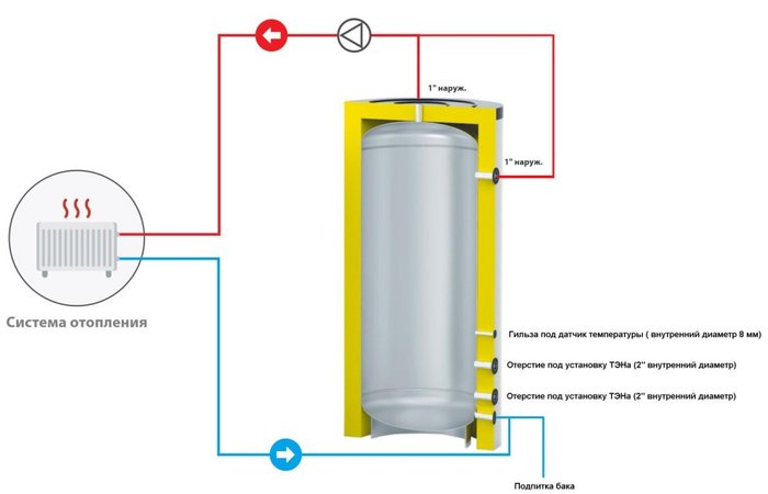 - Область применения: Аккумулирование нагретой технической воды.Материал изделия: Углеродистая сталь.Бак предназначен для аккумулирования тепла от электротэнов, которые размещаются в отверстия диаметром 2″ внутренняя резьба. Стандартное количество отверстий – 2 шт. Опционально можно разместить до 10 шт. На внешней стороне бака расположены шпильки для крепления шкафа управления электрическими ТЭНами. По желанию заказчика, возможно исполнение индивидуальной конфигурации данного бака.Опционально в состав бака входит защитный магниевый анод (расположен под теплоизоляцией в верхнем куполе).Изоляция бака выполнена по технологии NOFIRE из полиэфирного материала толщиной 70 мм, поддающегося 100% вторичной переработке (экологически безопасный материал), материал обладает высоким коэффициентом сопротивления теплопередачи, а также высоким классом огнестойкости класса B-s2d0 в соответствии с Европейскими требованиями EN 13501.С наружной стороны баки в стандартном исполнении объемом до 5000л включительно защищены пластиковой обшивкой, либо матерчатой обшивкой (по запросу). Цветовую гамму изоляций уточняйте у продающей стороны.Наружная поверхность бака окрашена термостойкой краскойБаки серии AT ETRO применяются в системах с электрическими нагревательными элементами (ТЭНами). В связи с этим, на баке может присутствовать от 2 до 10 отводов с внутренним диаметром резьбы 2”. В базовой оснастке бак поставляется только с двумя такими отводами. Также на баке есть 4 шпильки для крепления шкафа управления электронагревателями. Также бак может быть оснащен ревизионным фланцем, для технического обслуживания емкости (опционально). Область применения: Аккумулирование нагретой технической воды.Материал изделия: Углеродистая сталь.Бак предназначен для аккумулирования тепла от электротэнов, которые размещаются в отверстия диаметром 2″ внутренняя резьба. Стандартное количество отверстий – 2 шт. Опционально можно разместить до 10 шт. На внешней стороне бака расположены шпильки для крепления шкафа управления электрическими ТЭНами. По желанию заказчика, возможно исполнение индивидуальной конфигурации данного бака.Опционально в состав бака входит защитный магниевый анод (расположен под теплоизоляцией в верхнем куполе).Изоляция бака выполнена по технологии NOFIRE из полиэфирного материала толщиной 70 мм, поддающегося 100% вторичной переработке (экологически безопасный материал), материал обладает высоким коэффициентом сопротивления теплопередачи, а также высоким классом огнестойкости класса B-s2d0 в соответствии с Европейскими требованиями EN 13501.С наружной стороны баки в стандартном исполнении объемом до 5000л включительно защищены пластиковой обшивкой, либо матерчатой обшивкой (по запросу). Цветовую гамму изоляций уточняйте у продающей стороны.Наружная поверхность бака окрашена термостойкой краскойБаки серии AT ETRO применяются в системах с электрическими нагревательными элементами (ТЭНами). В связи с этим, на баке может присутствовать от 2 до 10 отводов с внутренним диаметром резьбы 2”. В базовой оснастке бак поставляется только с двумя такими отводами. Также на баке есть 4 шпильки для крепления шкафа управления электронагревателями. Также бак может быть оснащен ревизионным фланцем, для технического обслуживания емкости (опционально).