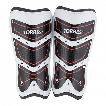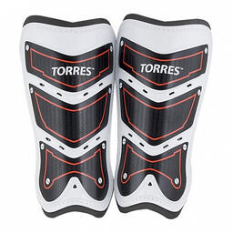 Легкие, прочные тренировочные футбольные щитки Torres training. Пластик (полипропилен), без голеностопа, внутренняя подкладка из синтетической пены (эва), отверстия в пластике и внутренней подкладке для вентиляции, 2 эластичных застежки на липучке (застегиваются сбоку).