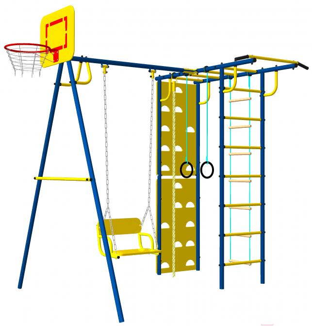 • Элементы комплекса в комплекте баскетбольная корзина, качели, стена для лазания, веревочная лестница, турник, канат, кольца, рукоход