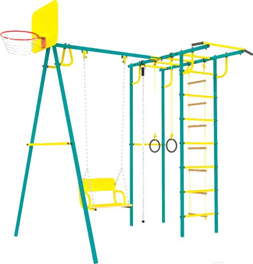 - Элементы комплекса в комплекте баскетбольная корзина, качели, веревочная лестница, турник, канат, кольца, рукоход
