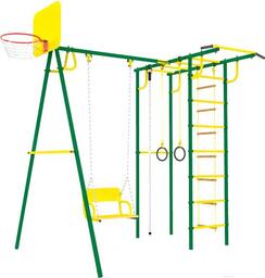 - Элементы комплекса в комплекте баскетбольная корзина, качели, веревочная лестница, турник, канат, кольца, рукоход