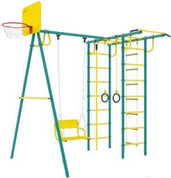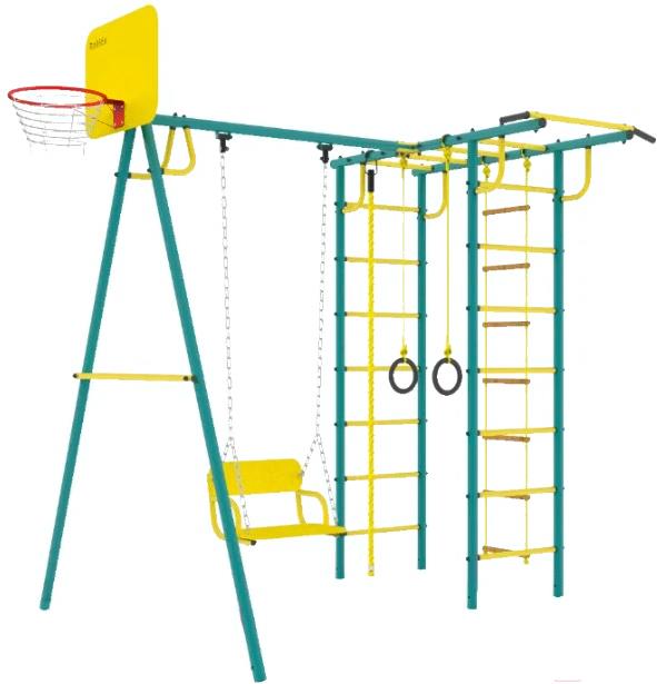 - Элементы комплекса в комплекте баскетбольная корзина, качели, веревочная лестница, турник, канат, кольца, рукоход