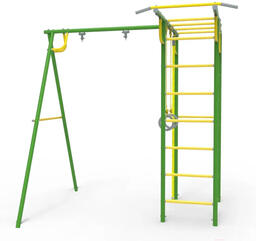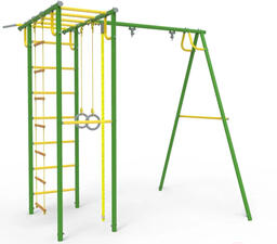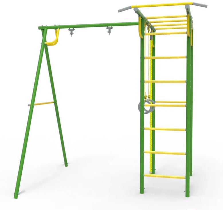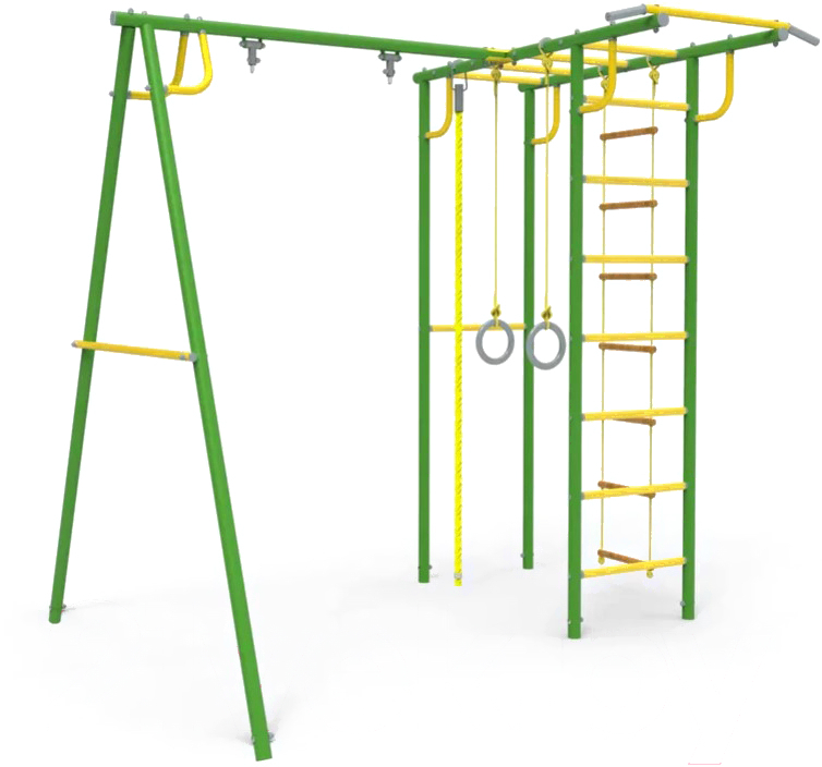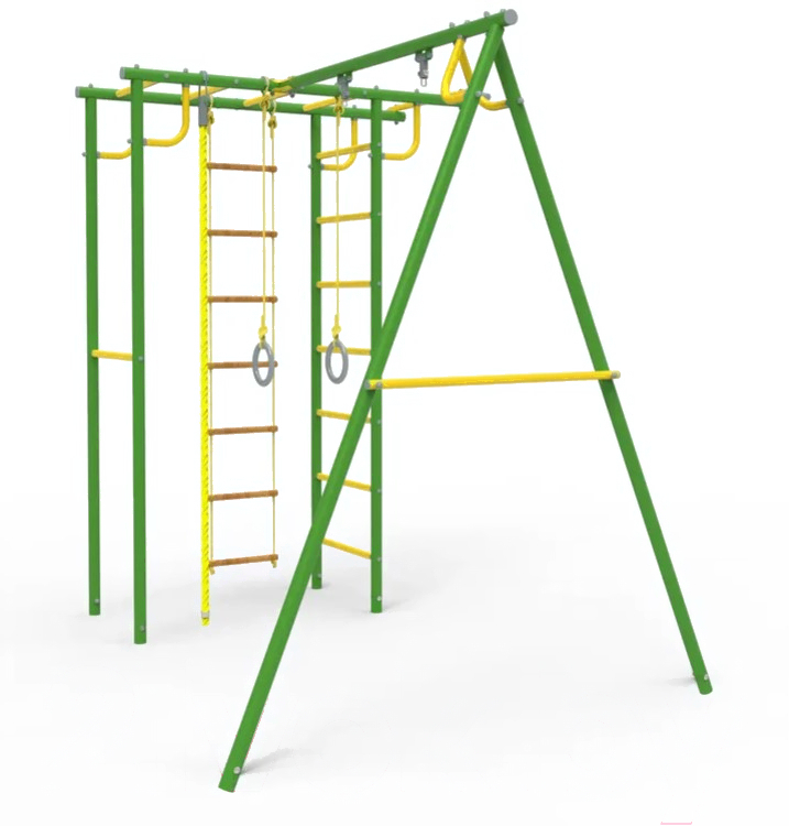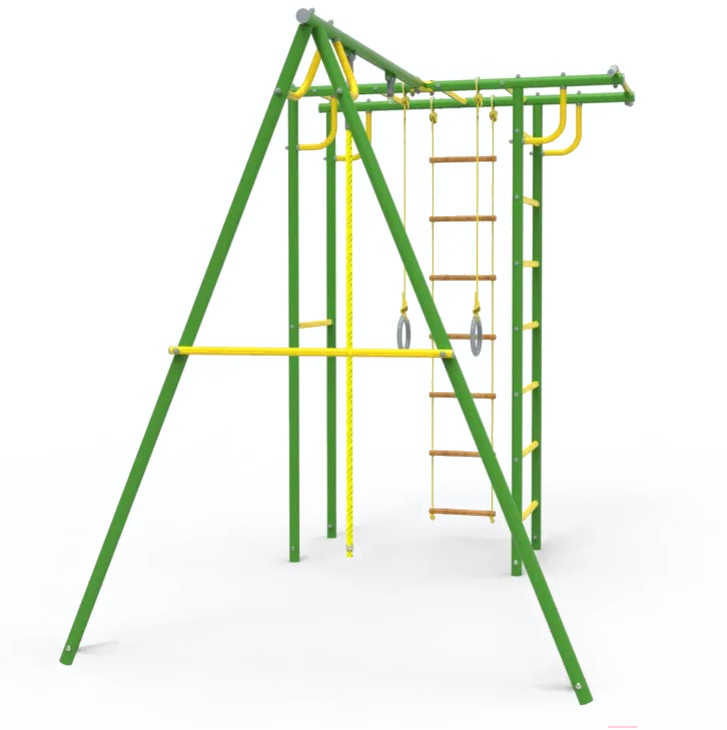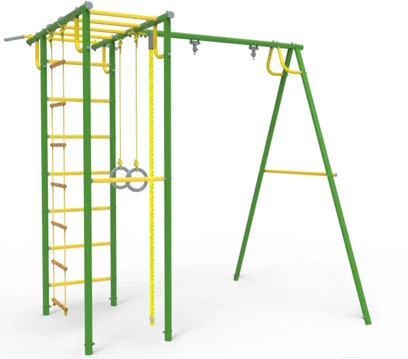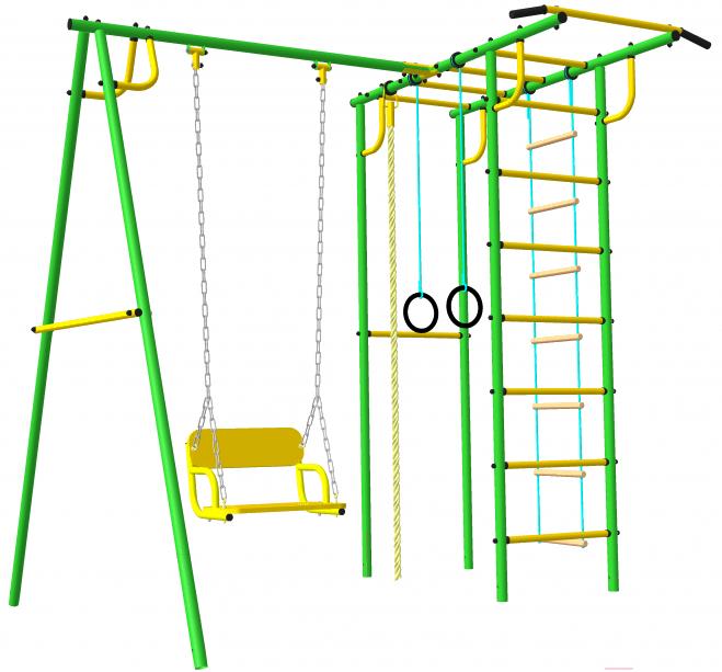 • Элементы комплекса в комплекте качели, веревочная лестница, турник, канат, кольца, рукоход
