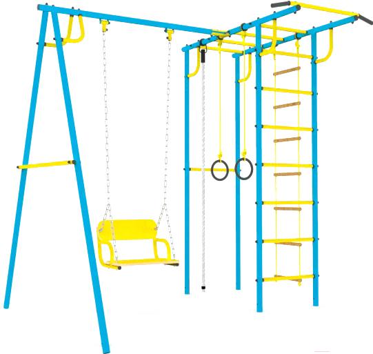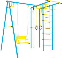 - Элементы комплекса в комплекте качели, веревочная лестница, турник, канат, кольца, рукоход