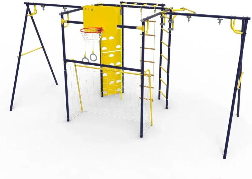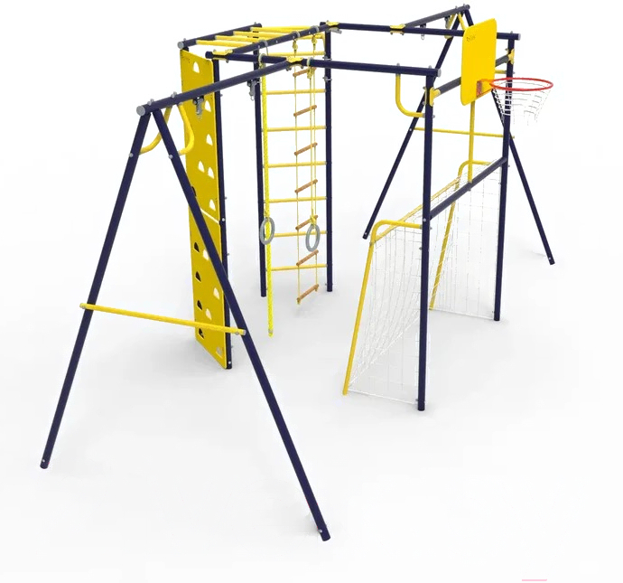 Элементы комплекса в комплектебаскетбольная корзина, качели (на цепях, качели-гнездо), стена для лазания, веревочная лестница, турник (регулируется по высоте), канат, кольца, трапеция, рукоход, футбольные ворота