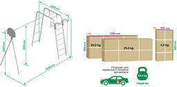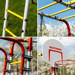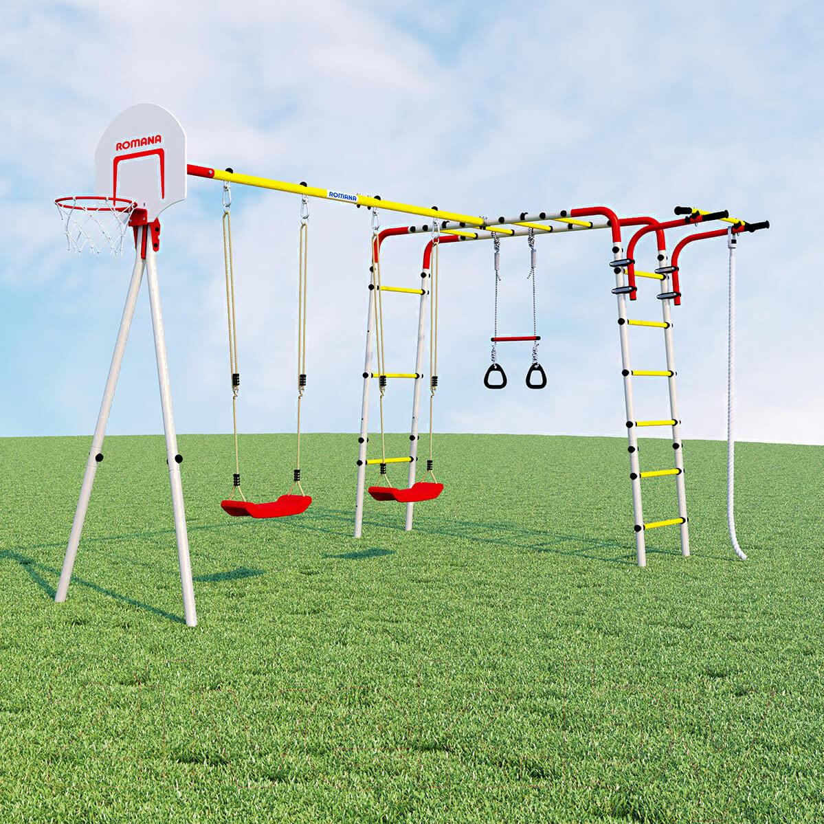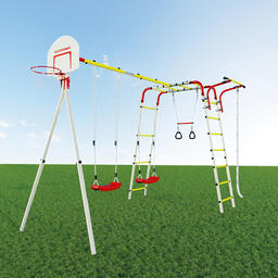 • Элементы в комплекте баскетбольная корзина, качели (пластиковые), турник, канат, кольца, лестница, трапеция, рукоход