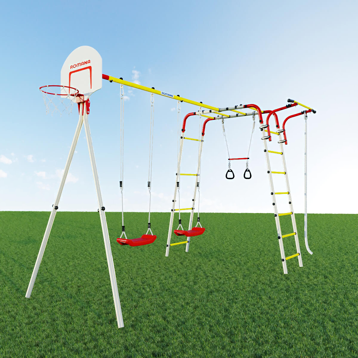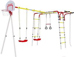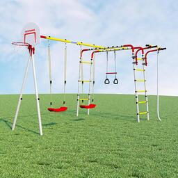 • Элементы комплекса в комплекте баскетбольная корзина, качели (пластик), турник, канат, кольца, лестница, трапеция, рукоход