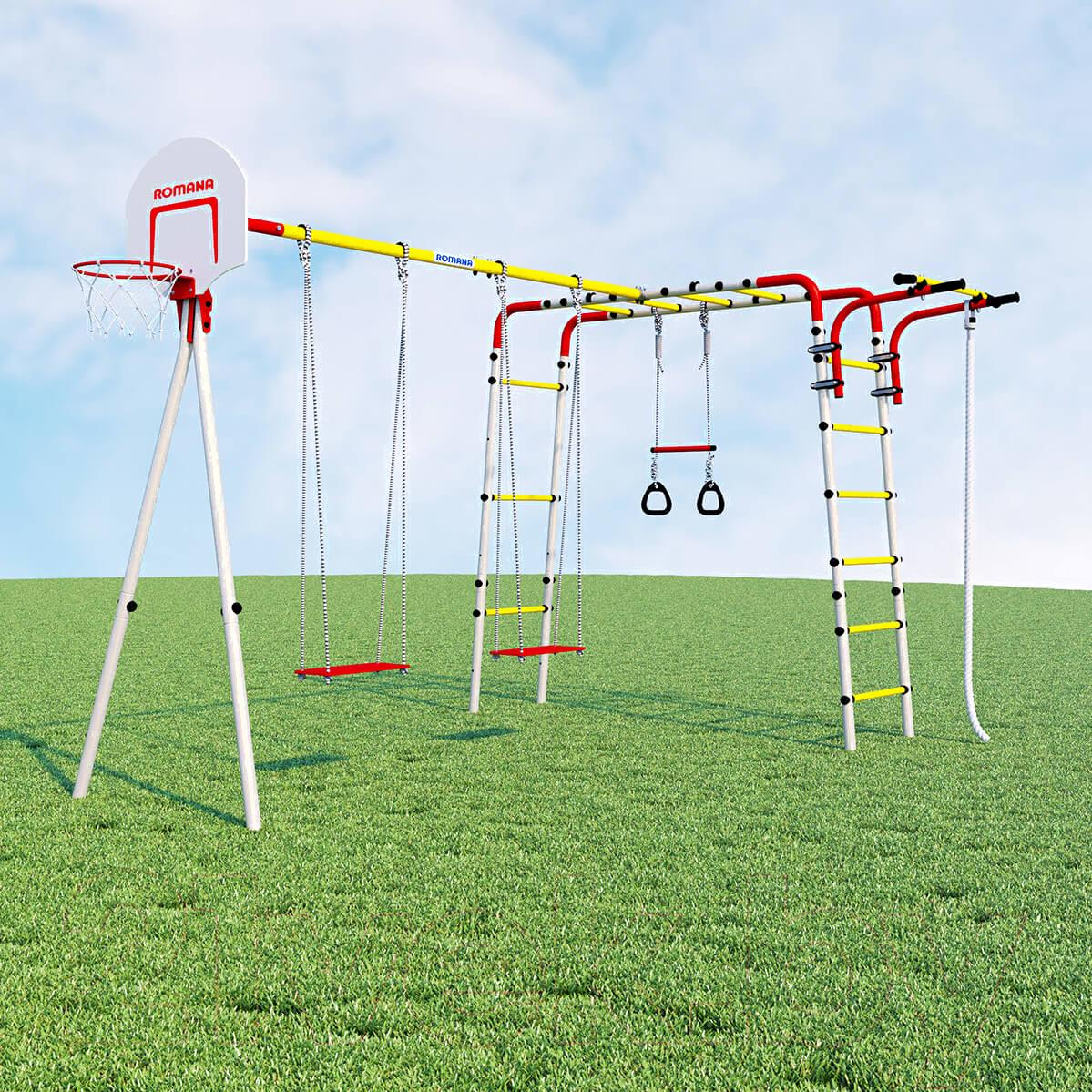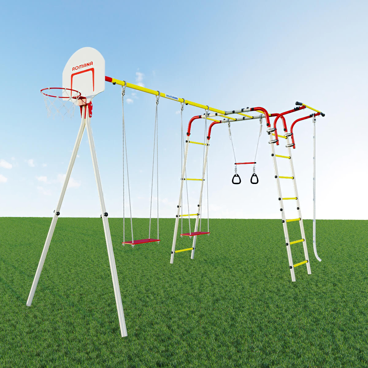 • Элементы в комплекте баскетбольная корзина, качели (фанера), турник, канат, кольца, лестница, трапеция, рукоход
