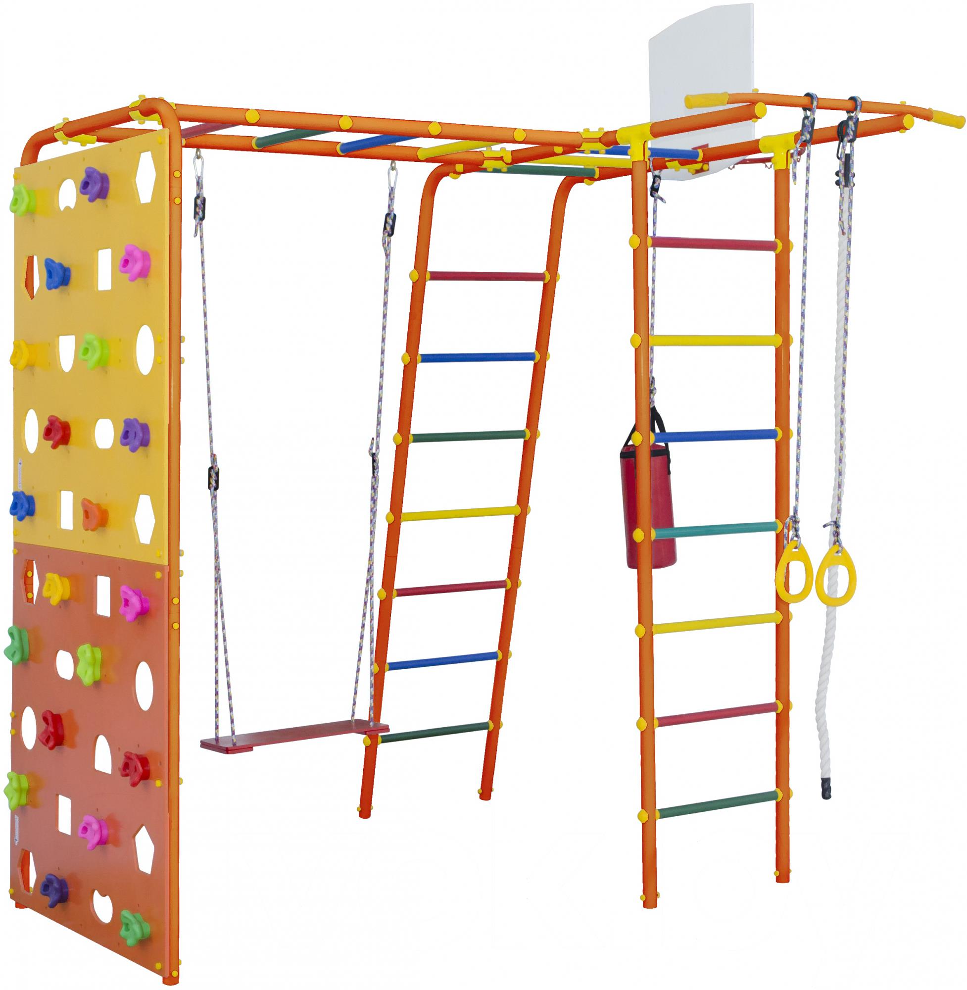 - Элементы в комплекте баскетбольная корзина, качели, стена для лазания, турник, канат, кольца, рукоход, боксерская груша