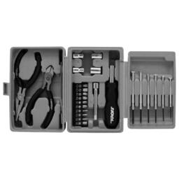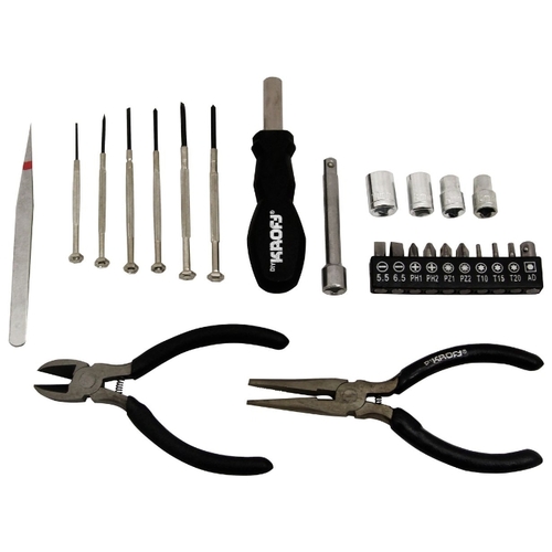- Инструменты в комплекте отвёртки, рукоять для бит, длинногубцы, кусачки, отвёртки для точных работ