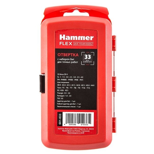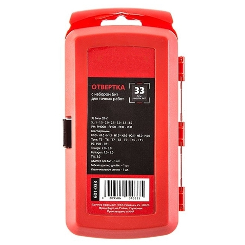 • Биты подробно SL1, SL1.5, SL2, SL2.5, SL3, SL3.5, SL4, PH000, PH00, PH0, PH1, H0.9, H1, H1.3, H1.5, H2, H2.5, H3, H4, T5, T6, T7, T8, T9, T10, T15, PZ0, PZ1, Tri2, Tri3, TW3; Penta-drive (Pentagon): 1, 2