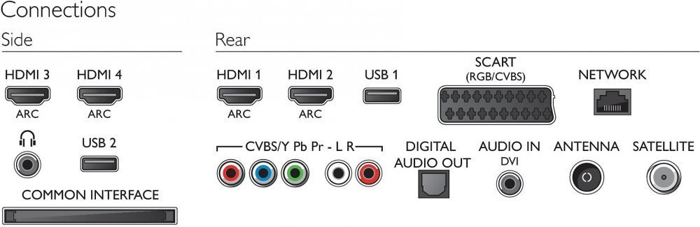 - Входы AV, 4 x HDMI, Miracast, RGB, RJ-45, SCART, 2 x USB, WiDi, 2 x аудио, компонентный
