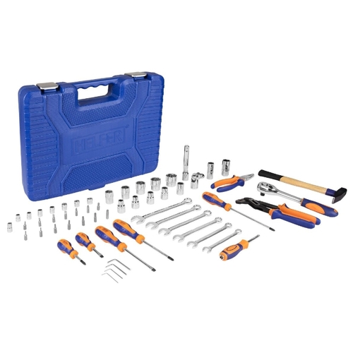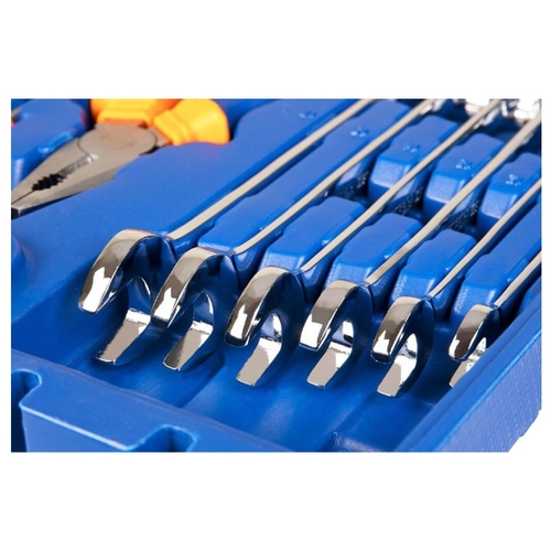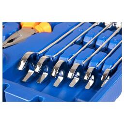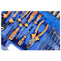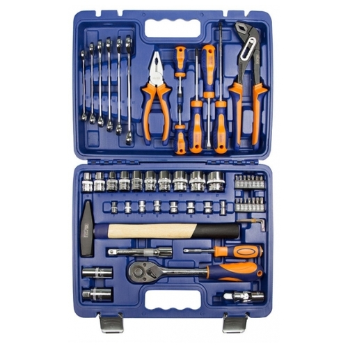 • Инструменты в комплекте молоток, отвёртки, рукоять для бит, трещотка, пассатижи, ключи гаечные, ключ переставной гаечный, ключи имбусовые (шестигранные)