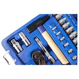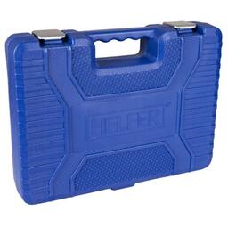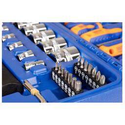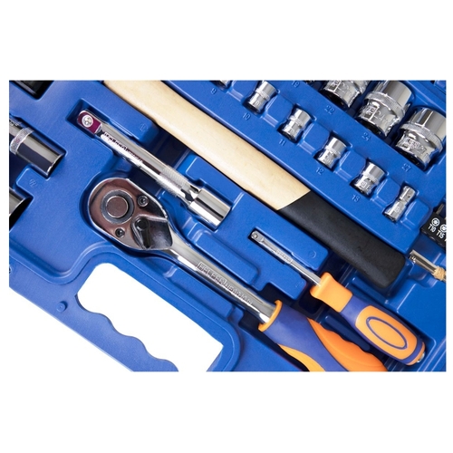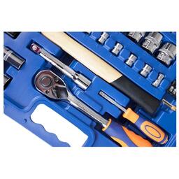 • Головки торцевые подробно 1/4": 7, 8, 9, 10, 11 ,12, 13 мм; 1/2": 10, 11, 12, 13, 15, 17, 19, 22, 24, 27 мм; свечные 1/2": 16, 21 мм; удлинитель 1/2": 125 мм; трещотка 1/2": 45 зубов
