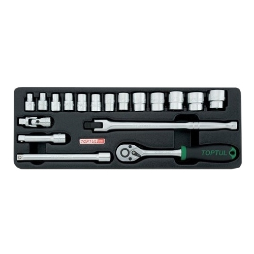 - Головки торцевые подробно 3/8": 6, 7, 8, 10, 11, 12, 13, 14, 17, 19, 21, 22, 24 мм; карданный шарнир 3/8"; удлинитель 3/8": 75, 150 мм; трещетка 3/8": 72 зуба; вороток с шарниром 3/8": 250 мм