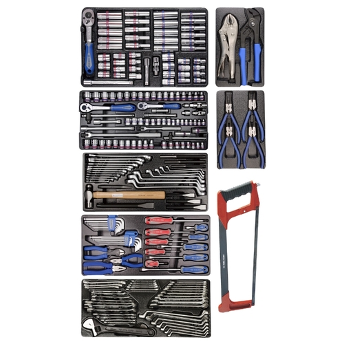 - Инструменты в комплекте молоток, отвёртки, вороток для головок, трещотка, пассатижи, круглогубцы, ножовка по металлу, ключи гаечные, кусачки, ключ разводной, ключ переставной гаечный, ключи имбусовые (шестигранные)