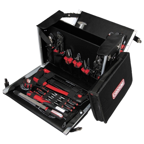 Инструменты в комплектемолоток, отвёртки, рукоять для бит, вороток для головок, трещотка, пассатижи, круглогубцы, ножовка по металлу, ключи гаечные, кусачки, отвёртки для точных работ, ключ разводной, ключ переставной гаечный, напильник по металлу, ключи имбусовые (шестигранные)