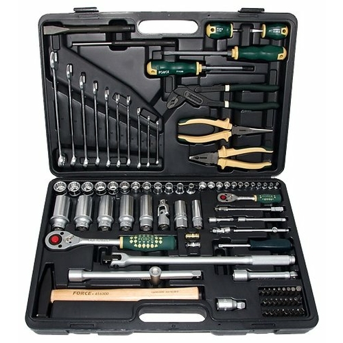 - Инструменты в комплекте молоток, отвёртки, рукоять для бит, вороток для головок, трещотка, пассатижи, ключи гаечные, ключ переставной гаечный