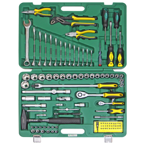 - Инструменты в комплекте молоток, отвёртки, рукоять для бит, вороток для головок, трещотка, пассатижи, круглогубцы, ключи гаечные