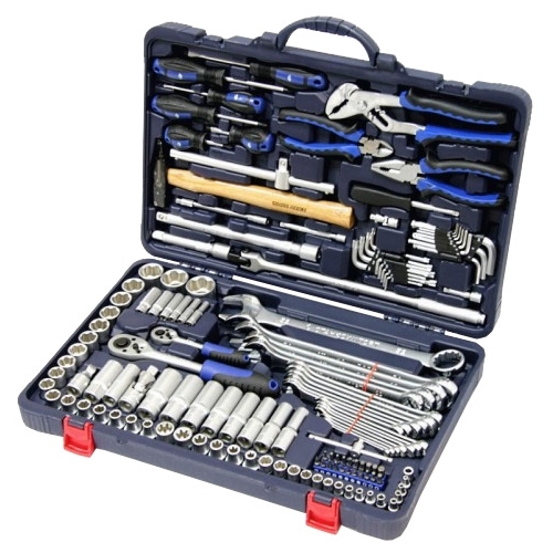 - Инструменты в комплекте молоток, отвёртки, рукоять для бит, вороток для головок, трещотка, пассатижи, ключи гаечные, кусачки, ключ переставной гаечный, ключи имбусовые (шестигранные)