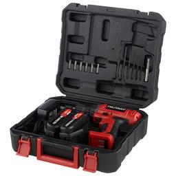 • Подробная комплектация два аккумулятора, зарядное устройство, набор сверл и бит, кейс