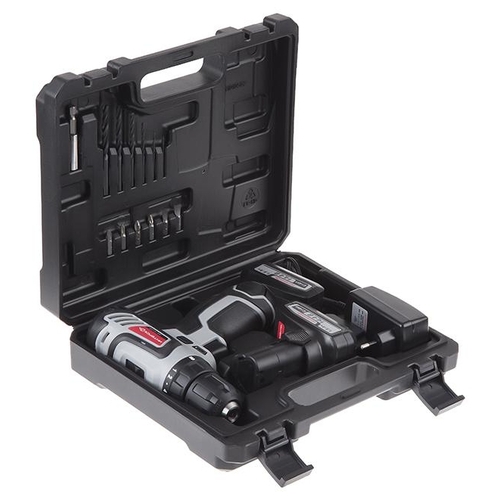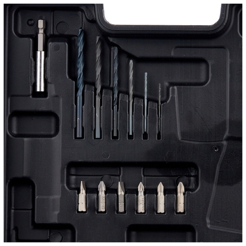 • Подробная комплектация два аккумулятора, зарядное устройство, комплект сверл и бит, кейс