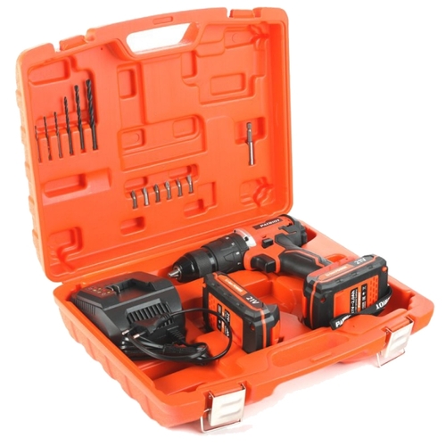 • Подробная комплектация два аккумулятора, зарядное устройство, набор сверл и бит, кейс