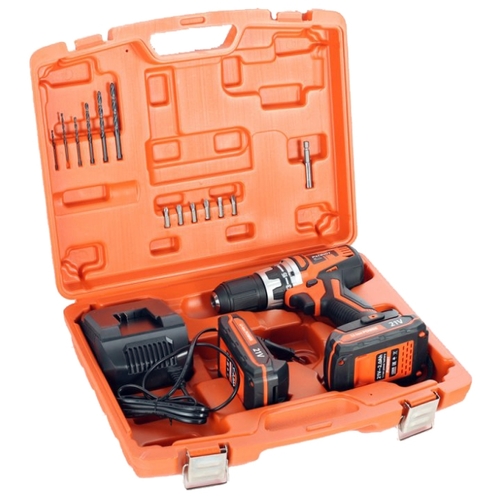 • Подробная комплектация два аккумулятора, зарядное устройство, набор сверл и бит, кейс