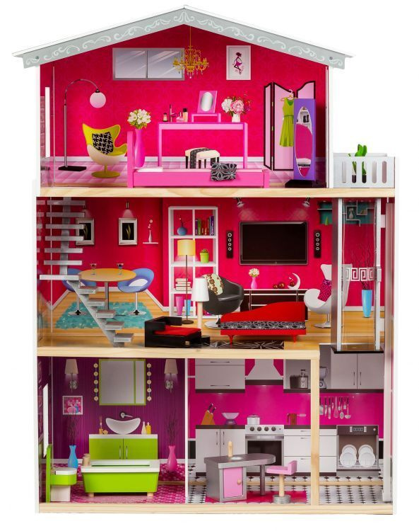 Трехэтажный деревянный домик для кукол Malibu с куклой и мебелью 10 элементов - ECOTOYS