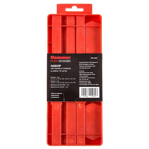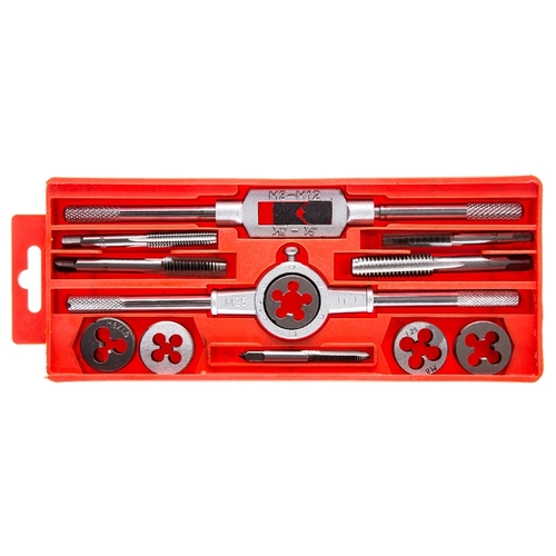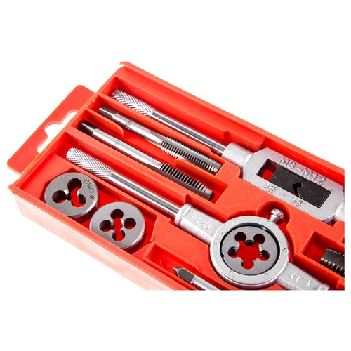• Подробная комплектация - 5 метчиков и 5 плашек: M6x1.0, M7x1.0, M8x1.25, M10x1.5, M12x1.75; - метчикодержатель; - плашкодержатель; - пластиковый кейс.