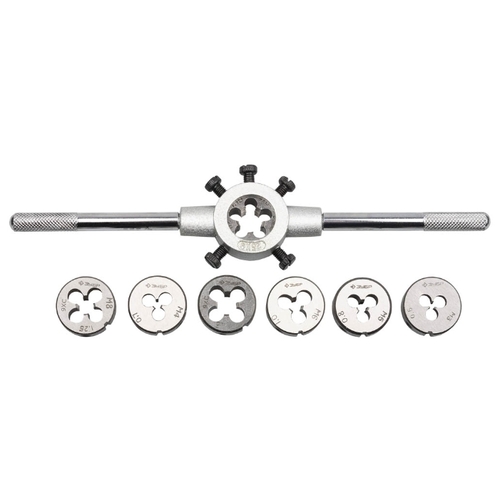 - Подробная комплектация - плашкодержатель; - 7 плашек: M3x0.5, M4x0.7, M5x0.8, M6x1.0, M8x1.25, M10x1.5, M12x1.75.