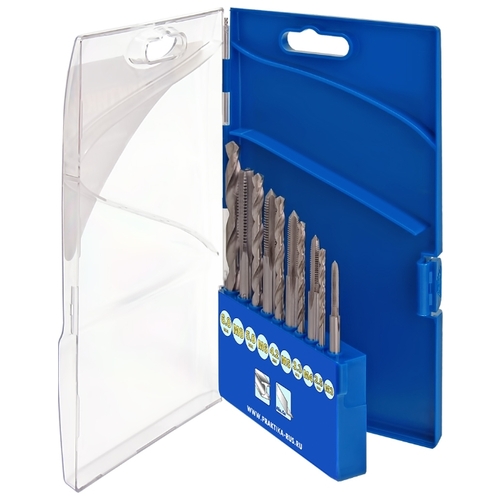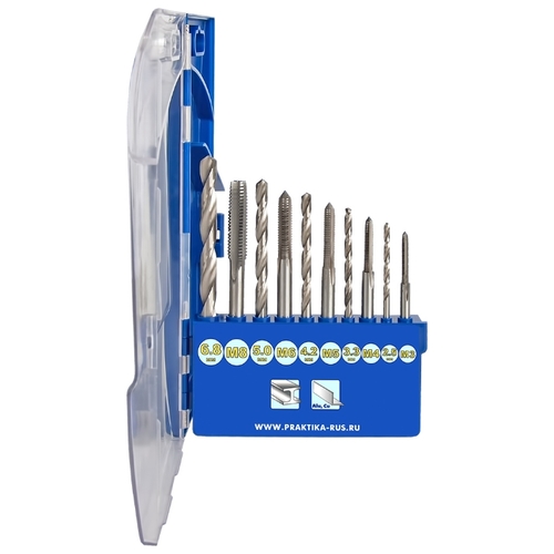 • Подробная комплектация - 5 метчиков: M3x0.5, M4x0.7, M5x0.8, M6x1.0, M8x1.25; - 5 сверл: 2.5, 3.3, 4.2, 5.0, 6.8 мм.