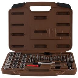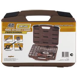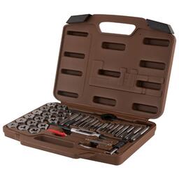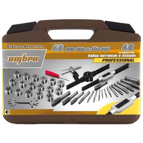 • Подробная комплектация - 17 метчиков и 17 плашек: M3x0.5, M3x0.6, M4x0.7, M4x0.75, M5x0.8, M5x0.9, M6x0.75, M6x1.0, M7x0.75, M7x1.0, M8x1.0, M8x1.25, M10x1.25, M10x1.5, M12x1.5,M12x1.75, 1/8NPT27; - держатель для метчиков (М3-М12); - вороток для метчиков Т-образный; - плашкодержатель 25 мм; - отвертка; - набор резьбомерный; - пластиковый кейс.