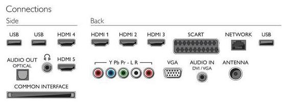 - Входы 5 x HDMI, RGB, RJ-45, SCART, 3 x USB, VGA, 2 x аудио, компонентный