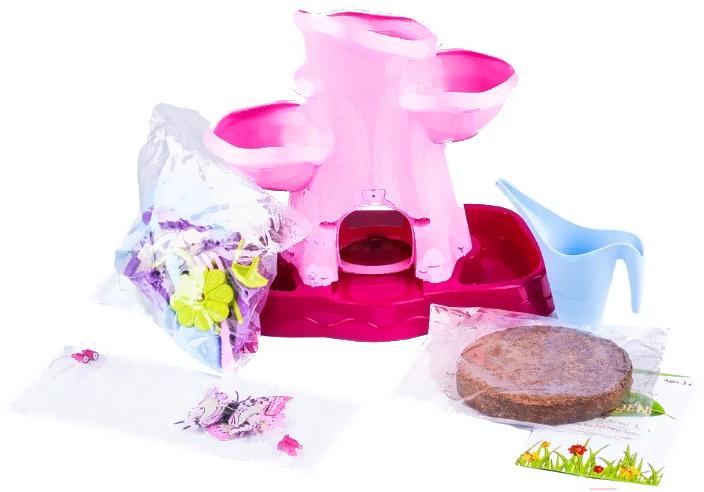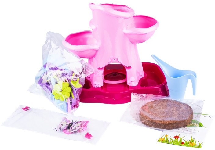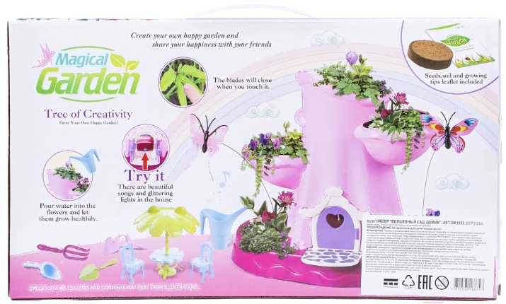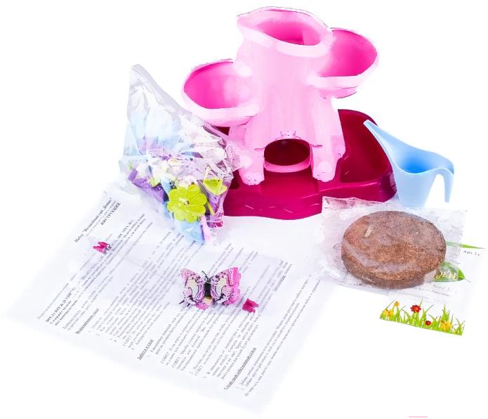 Комплектациярасходный материал (семена, грунт), инструменты для проведения опыта (лейка, 4 садовых инструмента), детали для сборки (домик, два стульчика)
